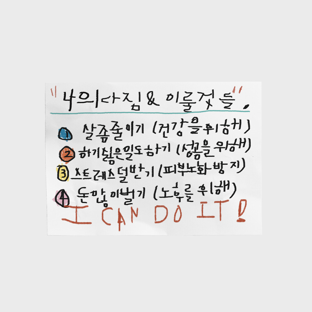 내가 이루고 싶은 것들을 명확하게 네 가지로 정리하며 실천 의지를 다지는 진지한 다짐을 담았습니다.